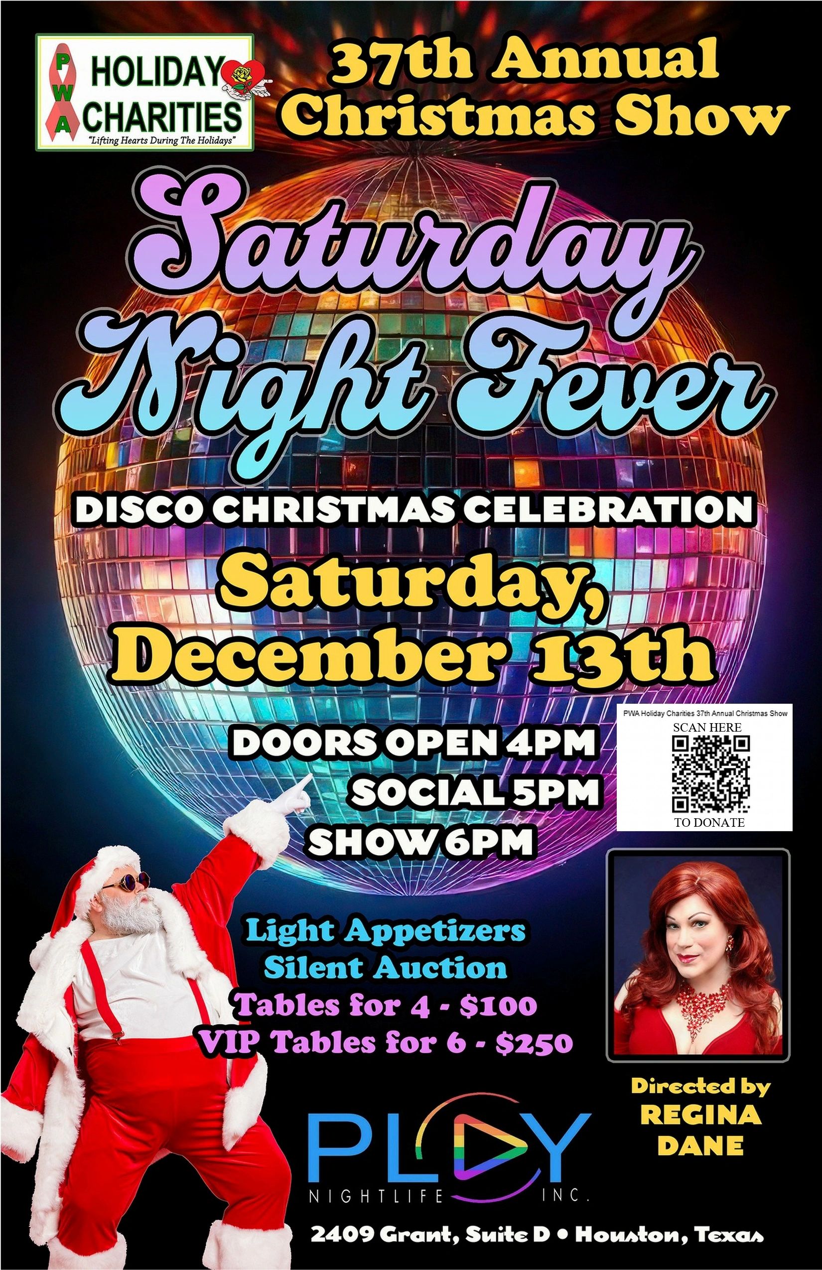 Get ready to hustle to the Montrose gayborhood for the 37th annual PWA Holiday Charities Christmas Show. We're going to boogie oogie oogie our way into the holiday spirit with some Saturday Night Fever!!! Doors open at 4 pm with light appetisers at 5 pm and a spectacular 6 pm show more dazzling than a disco ball. If you are interested in performing or reserving seating, please contact disco diva Regina Dane for more details. To donate to this event, please scan the QR Code. or click on this link>